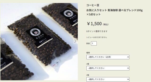 お試しセットは300gのコーヒー豆が入って1,500円なので、100gあたりの値段が250円も安くなります。(青海ブレンド×3も選べる)
