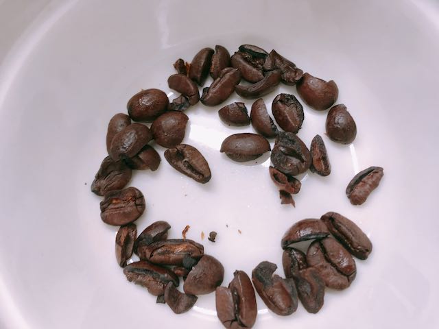 まず、 パッケージを開封すると、割れ、欠けなどの豆が相当数混入していて焦げたものも混じっています。