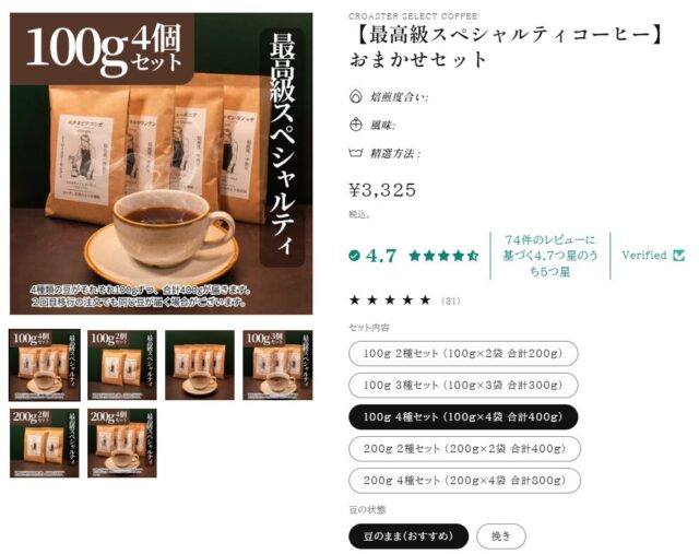 結論として、シーロースターでは豆の単品購入もできますが、買うべきは一番コスパが良い「4種セット」一択といえます。