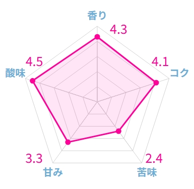 抽出すると、カップからはオレンジやストロベリー、マンゴーなど色んなフルーツの香りが漂います。実際に飲んでみると、フルボディの濃厚なコクとなめらかな舌触り、「これでもか!」というくらい強烈なフルーティさが感じられます。浅煎りとは思えないほどコクと旨味がしっかりと感じられて美味しいです。苦味はほとんど感じられず、酸味がメインの味です。ジューシーな味のコーヒーが好きな人におすすめしたい1杯です。