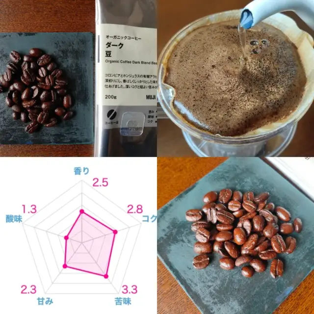 無印良品の「ダーク」は、写真の通りしっかりと深煎りで、酸味が少なくて飲みやすいです。値段が安いので特別な美味しさはないですが、この値段なら気にせず毎日気軽に飲めるのがいいですね。