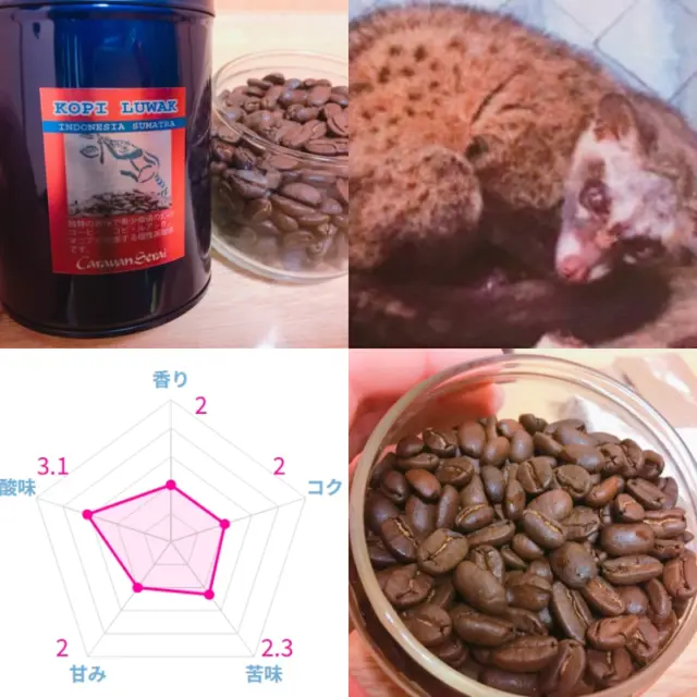 ジャコウネコの糞から採取したコーヒー。 マンデリンを薄くしたような味。 |