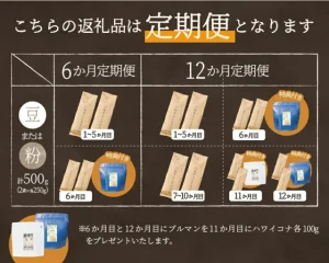 - 12か月→通常月は6か月コースと同じ。6か月目にブルマン、11か月目にハワイコナ、12か月目に再度ブルマンが届く
